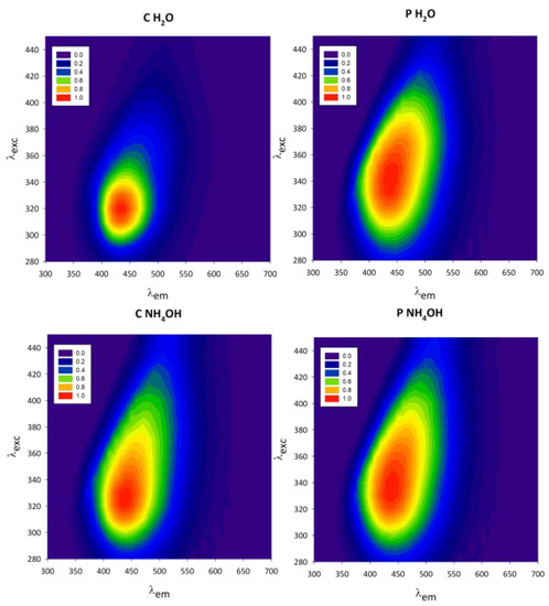 Normalized excitation–emission maps of chestnut (C H2O and C NH4OH) and peanut (P H2O and P NH4OH) native dispersions.