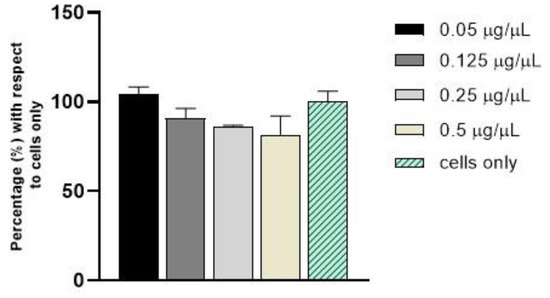 C H2O was tested at the concentrations of 0.05, 0.125, 0.25, and 0.5 µg/µL in fibroblast cells using an MTT assay (Figure 7). Overall, no statistically significant differences in cell viability were observed during the analysis, confirming that C-dots do not induce cytotoxicity after 24 h of incubation in comparison to cells only.