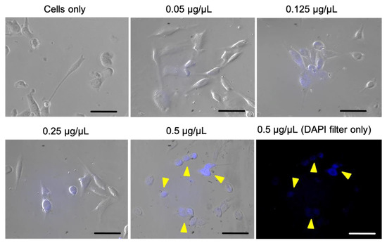 Cellular uptake after 6 h of incubation analysed by merging the bright field and DAPI filter (λem: 420 nm) images. In blue, C-dot internalization into cells (DAPI filter). Arrows indicate the C-dots in 0.5 µg/µL group. Scale bar is 50 µm.