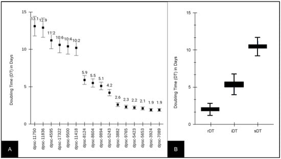 Doubling time (DT) of experimental DPSC isolates (n = 16). (A) Slow doubling times or sDT (10.2 to 13.1 days), intermediate doubling times or iDT (4.2 to 5.9 days) and rapid doubling times or rDT (1.9 to 2.6 days) were observed among the DPSC isolates. (B) rDT DPSC isolate average doubling time was 2.16 ± 0.265 days, which was different from that of the iDT DT, which was 5.18 ± 0.727 days (p = 0.0022), and that of the sDT DT, which was 11.4 ± 1.29 days (p = 0.00011).