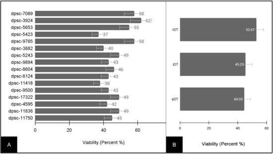 Baseline viability of experimental DPSC isolates (n = 16). (A) Viability ranged between 37% (dpsc-5423) and 62% (dpsc-3924), with an average of 47.31% ± 7.53. (B) Sorting by DPSC growth rate demonstrated rDT average viability (52.67% ± 8.41), iDT average viability (45.25% ± 7.82) and sDT average viability (44.33% ± 7.24) were not significantly different, p > 0.05.