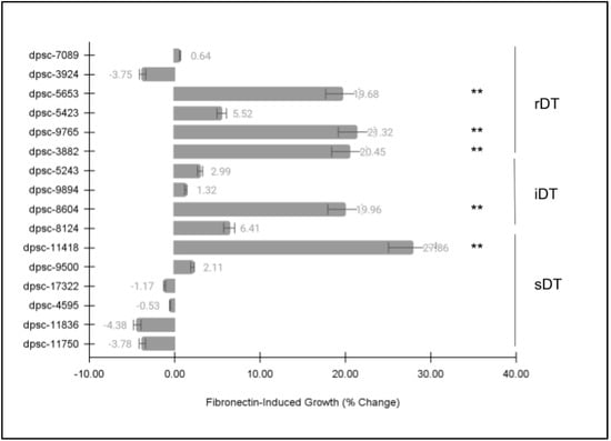 Each of the DPSC isolates was then plated on the extracellular matrix (ECM) glycoprotein recombinant human fibronectin (FN) to determine if there were any observable differences in cellular phenotype (Figure 3). These data clearly demonstrated statistically significant differences among some, but not all, of the DPSC isolates. More specifically, five (n = 5) DPSC isolates exhibited statistically significant changes in growth under FN-induced assay conditions. These included three rDT DPSC isolates: dpsc-5653 (+19.68%), dpsc-9765 (+21.32%), dpsc-3882 (+20.45%); one iDT DPSC isolate: 8604 (+19.94%); and one sDT DPSC isolate: dpsc-11418 (+27.86%), p = 0.0000033.