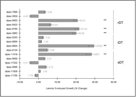 DPSC growth assay with laminin-5 (LN5). Five (n = 5) DPSC isolates exhibited statistically significant changes in growth under LN5-induced assay conditions, including rDT DPSC isolates dpsc-5653 (+20.81%), dpsc-9765 (+21.60%), dpsc-3882 (+20.08%); iDT DPSC isolate 8604 (+29.60%); and sDT DPSC isolate dpsc-11418 (+28.27%), p = 0.000045. (** denotes statistical significance).