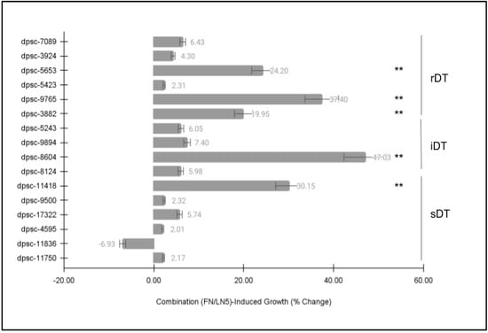 DPSC growth assay with ECM of combined fibronectin (FN) and laminin-5 (LN5). Five (n = 5) DPSC isolates exhibited statistically significant changes in growth under the combination of FN/LN5-induced assay conditions, including rDT DPSC dpsc-5653 (+24.20%), dpsc-9765 (+37.40%), dpsc-3882 (+19.95%); one iDT DPSC isolate, dpsc-8604 (+47.03%); and one sDT DPSC isolate, dpsc-11418 (+30.15%), p = 0.0032. (** denotes statistical significance).