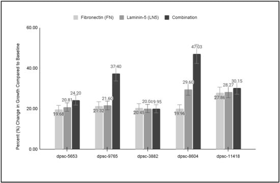To evaluate whether any of the changes in growth among the DPSC isolates in response to FN, LN5 or their combination were related to other phenotypes, the data regarding the cellular viability in all the experimental assays were compiled (Figure 7). These data clearly demonstrated that the plating of the DPSC isolates on FN had non-significant, positive effects on cellular viability which averaged 4.57% and ranged between 2.10% and 6.19%. In addition, assays with LN-5 also demonstrated positive, non-significant effects on viability, which averaged 4.67% and ranged between 2.16% and 7.81%. Finally, the combination of FN and LN5 induced positive effects on cell viability, which averaged 6.01% and ranged between 2.82% and 6.71% with two statistically significant exceptions: dpsc-9765′s viability increased by 18.98% (p = 0.033) and dpsc-8604′s viability increased by 21.30% (p = 0.032).