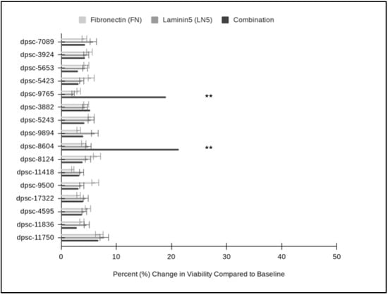 Comparison of individual and combination DPSC viability assays. FN increased cellular viability (average 4.57%; range from 2.10% to 6.19%), which was not significantly different from baseline viability or that of LN5 (average 4.67%; range from 2.16% to 7.81%), p = 0.832. Combination treatment increased cell viability an average of 6.01% (range from 2.82% to 6.71%) with two statistically significant exceptions: dpsc-9765′s viability increased by 18.98% (p = 0.033) and dpsc-8604′s viability increased by 21.30% (p = 0.032). (** denotes statistical significance).