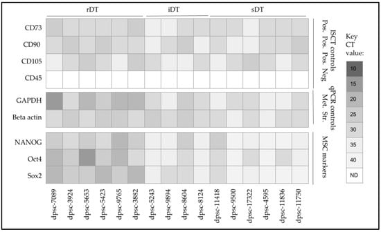 qPCR screening of DPSC mRNA for biomarkers. The expression of ISCT positive control stem cell biomarkers CD73, CD90 and CD105 was confirmed, as well as the absence of CD45. Expression of metabolic (GAPDH) and structural (beta actin) mRNA controls were observed among all DPSC isolates. The expression of MSC biomarkers NANOG, Oct4 and Sox2 was confirmed, with higher expression observed among the rDT isolates, as well as iDT dpsc-8604 and sDT dpsc-11418.