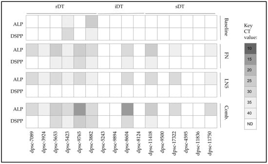 Screening of DPSC mRNA expression pre- and post-treatment. Baseline expression of alkaline phosphatase (ALP; bone and chondrocyte marker) and dentin sialophosphoprotein (DSPP, tooth biomarker) were expressed only in rDT dpsc–5423 and dpsc-3882. Administration of FN and LN5 induced expression of ALP among all rDT isolates, one iDT (dpsc-8604) and three sDT isolates (dpsc-11418, dpsc-17322, dpsc-11750). Only administration of FN or the combination of FN and LN5 induced expression of DSPP among some rDT (dpsc-5653, dpsc-5423, dpsc-9765, dpsc-3882), iDT (dpsc-8604) or sDT (dpsc-11418) isolates.
