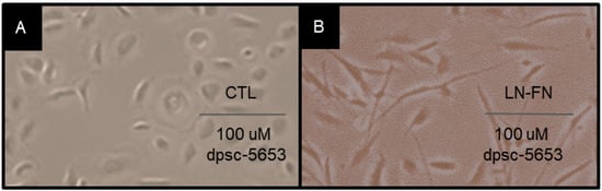 Cellular microscopy DPSC isolate dpsc-5653 under control and experimental conditions. (A) Untreated and control (CTL) dpsc-5653 in culture were compared with experimental ECM-treated (LN-FN) cells (B) demonstrating more robust proliferation under ECM treatment with some changes in cellular morphology, including extensive filopodia and lamellipodia.