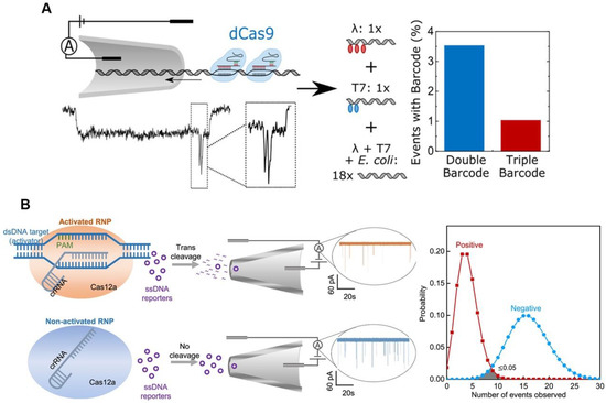 The high sensitivity of CRISPR/Cas-based detection is typically based on isothermal amplification that can amplify nucleic acid molecules; however, the use of the isothermal amplification reagents raises the cost of CRISPR/Cas-based diagnosis. Because of its high sensitivity, electrical signal sensing could be a candidate for amplification-free CRISPR/Cas-based diagnosis [32,33]. Electrical signal-based CRISPR/Cas diagnosis is typically performed using a defective Cas protein such as dCas9, which can only bind and not cleave target nucleic acid molecules. Hajian et al. fixed the CRISPR/dCas9 to a field effect transistor (gFET), and when the RNP recognized and bound a target nucleic acid molecule, the gFET conductivity changed, therefore reporting the detection result [34]. Their sensor is based on the idea that charged DNA molecules can be captured by dCas9 immobilized on graphene, which lowers the system’s resistance and results in a larger current response. To prevent the nonspecific adsorption of charged molecules, the remaining graphene surface was blocked. A drop of the sample was applied to the apparatus while it was in use; it was left while it was incubated, washed, and eventually had the electrical conductivity of the platform evaluated by two platinum electrodes. The method has a detection limit of 15 fM without amplification, and the detection time is about 15 min. The nanopore sensor can also be used as a signal sensing method for CRISPR/dCas9-based diagnostic by detecting the characteristic blockade signal of dCas9-DNA as it passes through the nanopore [35]. The nanopore signals (ion current) for different dCas9-binding sites can be resolved, which could lead to a multiplexing strategy. Signal barcodes can be created to distinguish the different sequences of the DNA using different crRNAs, which can bind to different sites on the same DNA (Figure 2A) [36]. This method’s ability to discriminate between different DNA sequences in DNA mixture demonstrates its specificity and potential for multiplexing. Although dCas9 can detect and type single DNA, its application is limited by low throughput. Additionally, because there is a decreased probability of the target DNA strand passing through the nanopore in samples containing less target DNA, a longer measuring time is needed. The trans-cleavage of Cas12a may be able to provide a solution to this issue. The Cas12a trans-cleavage can degrade the DNA probes of nanopore, causing the electrical signal of the DNA probes to change significantly. The Cas12a-based nanopore sensing technology can amplify the detection signal, using its trans-cleavage activity to achieve rapid and sensitive detection of HIV-1 and SARS-CoV-2 (Figure 2B) [37,38].
