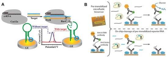 Electrochemical sensing for CRISPR-based diagnosis. (A) A schematic diagram of the CRISPR biosensing method based on electrochemical label. Reproduced with permission from Ref. [40]. (B) A working principle of glucose oxidase-based electrochemical CRISPR assay. Reproduced with permission from Ref. [42].