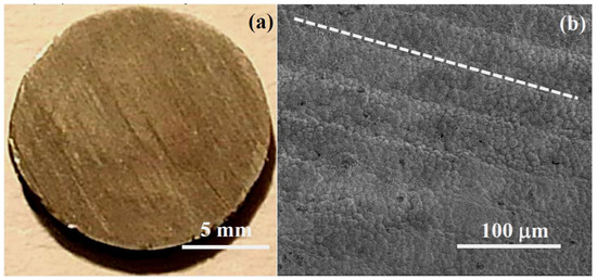 The SEM study showed a continuous, uniform film of calcite micro-crystals with an excellent coverage of the Mg surface. Figure 1a shows an optical image of a coated disk. Immersion in carbonated water results in the homogeneous change of color of the surface, from metallic shine to a dull, matte brown surface. The parallel lines that can be observed at the disk surface are the cutting lines that preexisted in the Mg sample, indicating that the coating does not modify the surface morphology of the Mg disks at the macro-scale. Morphological observations in the micro-scale by using SEM (Figure 1b) show the formation of a textured layer of microparticles. It can be also observed the pattern of aligned cutting lines on the surface of the coated disk in the direction indicated, as a guide to the eye, by the dashed line (Figure 1b).