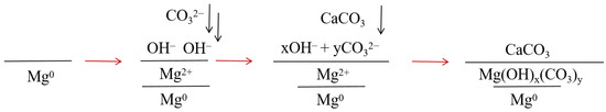 The surface chemistry of the coating is described in the scheme in Figure 2. The tentative mechanism of formation involves the substitution of hydroxyl groups at the surface of Mg by carbonate groups and the nucleation and growth of CaCO3. CaCO3 is a very important mineral compound in geological and environmental sciences. It is the most abundant biomineral, present in geological deposits and ocean sediments, and many living organisms and biominerals such as pearl or mollusk shells. Its functions include structural support (i.e., bones) and protection (i.e., shells) [27]. CaCO3 precipitation is not a simple process as it exists as an amorphous calcium carbonate (ACC) phase, different hydrated metastable phases, and three anhydrous crystalline polymorphs (calcite, aragonite, vaterite) [28]. Controlled mineralization of CaCO3 has been actively investigated [29] and further research is still needed. Most studies to date have dealt with the nucleation and crystallization of particles in solution, but comparatively few reports can be found on the formation of carbonate coatings [30]. The development of the calcium carbonate surface protection method on Mg was carried out in a preliminary phase by studying reactions in carbonated water from the native corrosion product of Mg, i.e., Mg hydroxide, brucite, and Mg(OH)2, to determine the formation of appropriate interfaces and of the chemical bond, by conversion from the hydroxide to the interface material of the coatings. Preliminary tests of brucite in carbonated water allowed the establishment of optimal conditions for the development of Mg hydroxycarbonates (hydromagnesite Mg3(CO3)4(OH)2·4H2O and giorgiosite Mg3(CO3)4(OH)2·5H2O) as intermediate phases for magnesium-doped calcite growth. XRD analysis and Raman microspectroscopy studies demonstrated the formation of hydromagnesite (hydroxycarbonate of magnesium) as an intermediate phase suitable for the nucleation of calcium carbonate [13]. The mechanism of formation of the coating in carbonated water containing Ca2+ ions is based on the dissolution of the native corrosion product of Mg, Mg(OH)2, the anions OH- being replaced at the oxidized metal surface (Mg2+) by CO32− anions, nucleating Mg carbonate hydrates as transient phases, with the increase of [OH-] in the aqueous solution leading to a local increase in pH, activating the precipitation of magnesian calcite. Therefore, a subsequent step in our research was to directly prove the presence of hydroxyl and carbonate groups and to determine the evolution with time of both species on the carbonated Mg surface.