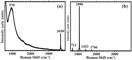 We have used Raman spectroscopy to determine the presence of hydroxyl and carbonate groups in the coating film formed on Mg. Raman spectroscopy is a very powerful technique for the phase identification of any calcium carbonate as it can clearly identify and discriminate between ACC and each different crystalline allotrope of CaCO3, while also being a rapid, non-destructive technique suited for the study of thin films, suitable for mapping the spatial distribution of each carbonate phase with a lateral resolution of a few microns [31,32,33]. Moreover, Raman spectroscopy is an excellent analytic method to identify the presence of hydroxyl groups from their characteristic symmetric stretching vibration at 3600–3700 cm−1 [34]. Figure 3a shows the Raman spectrum of the amorphous hydroxide layer formed on Mg immediately after immersion in the carbonated water solution. The presence of the characteristic sharp band at 3650 cm−1 indicates the formation of a hydroxide layer at the Mg surface [34]. The Raman spectrum of calcite (Figure 3b) has a dominant band at 1086 cm−1 and secondary bands located at 711, 1433, and 1746 cm−1, assigned to the A1g and Eg vibrational modes, respectively, of the calcite CO3 group [35]. We used the evolution of the intensities of the Raman bands at 3650 cm−1 and 1086 cm−1, corresponding to the presence of hydroxyl and carbonate groups, respectively, to evaluate the degree and kinetics of hydroxyl substitution with carbonate, according to the surface reaction scheme proposed in Figure 2. The evolution with the immersion time of the intensities of both Raman bands is shown in Figure 4.