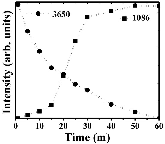 Figure 4 illustrates the incorporation of carbonate groups into the coating. The intensity of the 1086 cm−1 vibration band grows gradually, almost linearly, immediately after immersion, until an abrupt surge is observed at 20 min immersion time. We explain this sudden increase by the homogeneous formation of crystalline calcite nuclei along the coating. Regarding the hydroxyl groups, the intensity of the 3650 cm−1 band decreases gradually until it practically disappears after 60 min immersion, when calcite bands remain the only Raman features.