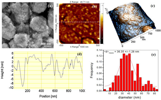 SEM (a); bi-dimensional (b) and tri-dimensional (c) AFM images showing the surface morphology after 20 min of immersion, scanned on a 1 μm × 1 μm region. Characteristic line scan surface profile (d) showing the nano-scale rugosity of the coating and histogram of the surface nanoparticles size (e) fitted with a Gaussian distribution.