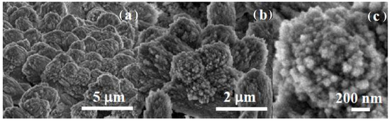 SEM images at different magnifications ((a), 5 µm; (b), 2 µm; (c), 200 nm) showing the nucleation of calcite nano-crystals in the carbonate layer.