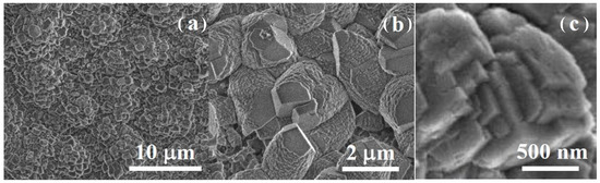 Calcite layer formed by the coalescence of growing calcite crystals: SEM ((a), 10 µm; (b), 2 µm; (c), 500 nm).