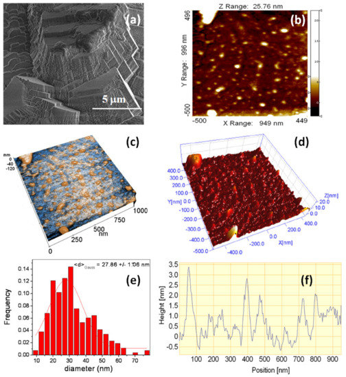 Raman spectra were recorded in a Horiba Jobin Yvon LabRam HR spectrometer using a 325 nm excitation laser. The spectra were recorded in the region 400–4000 cm−1 by adding three successive measurements using an integration time of 30 s per measurement and a total acquisition time of 90 s for each full spectrum. A high-resolution microscope Quanta3D FEG operating between 2 and 10 kV was used for the morphological studies by scanning electron microscopy (SEM). Atomic force microscopy (AFM) measurements were recorded using an XE100 microscope (Park Systems, Suwon, Republic of Korea) equipped with flexure-guided, cross-talk-eliminated scanners. All images were recorded with sharp PPP-NCHR tips (NanosensorsTM) with less than 10 nm tip radius of curvature (typically 8 nm), approx. 125 μm length, approx. 30 μm width, approx. 42 N/m force constant, and approx. 330 kHz resonance frequency. “True non-contact” working mode was used to minimize tip–sample interaction. AFM images were processed with the XEI program (v 1.8.0—Park Systems) for roughness evaluation and the SPIP program (Version 4.6.0.0) developed by Image Metrology, and are presented in “enhanced color”™ viewing mode to highlight morphological details. Representative line scans were selected, showing the surface profiles in detail. The root-mean-squared roughness (Rq) represents the standard deviation of the height value in the image, while the peak-to-valley parameter (Rpv) is the height difference between the lowest and highest point.
