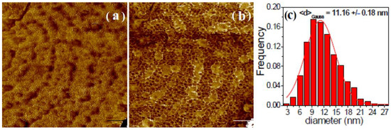 Raw bi-dimensional AFM images (unprocessed/as registered) scanned on a 1 μm × 1 μm region on a calcite crystal facet, showing the amplitude (a) and phase contrast (b) after 1 day of immersion. The small particles histogram (c), fitted by a Gaussian distribution, suggests a smaller mean diameter of approximately 11 nm.