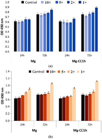 Viability of NCTC mouse fibroblasts (a) and SaOS-2 human osteoblasts (b) cultured in the presence of Mg and Mg-CC1h, for 24 h and 72 h, evaluated by the MTT test. The viability of the treated cells was obtained in reference to the negative control (untreated cells), considered to be 100% viable. The data were expressed as the average of the samples analyzed in triplicate (mean ± SD).