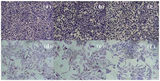 The cell morphology was determined by optical microscopy with the help of Giemsa staining after 72 h of cell cultivation in the presence of different concentrations of the test samples. After removing the culture medium, the cells were washed with phosphate buffered saline (PBS) and fixed with cold methanol (−20 °C) for 5 min. After removing the fixative, the cells were washed with distilled water and stained with Giemsa solution for 20 min. Later, after washing the cells with distilled water, they were examined with a Zeiss Axio Observer D1 optical microscope. Giemsa staining is used to differentiate the nuclear and cytoplasmic morphology of different cell types, staining the nuclei in dark blue to purple and the cytoplasm in different shades of blue.