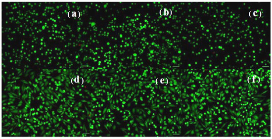 Fluorescent staining with calcein-AM (green) and ethidium homodimer-1 (red) of NCTC live and dead cells, untreated (a) and treated with solutions of the Mg (b) and Mg-CC1h samples (c) for 24 h; and SaOS-2 osteoblasts untreated (d) and treated with dilutions of the Mg (e) and Mg-CC1h samples (f) for 24 h. Scale bar = 50 μm.