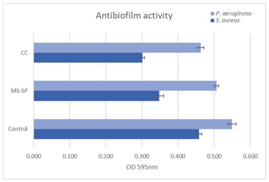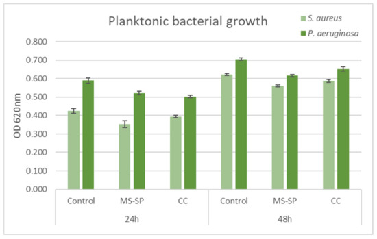 The planktonic bacterial growth was monitored in time by means of spectrophotometric measurements. After 24 h of cultivation on the 3D-printed scaffolds, S. aureus registered a decrease when compared to the untreated control, MS-SP being more efficient in inhibiting bacterial viability. The trend was maintained also at 48 h, with S. aureus being more susceptible when compared to P. aeruginosa (Figure 15). Nevertheless, both types of scaffolds interfered with the planktonic microbial growth when compared to the strain control cultivated in a broth medium.