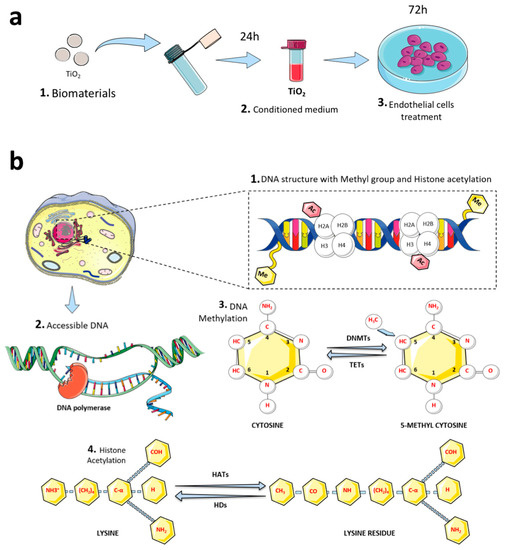 Titanium discs were previously prepared to subject their surfaces to dual acid-etching (DAE; w_Ti) and they were compared to machined surfaces (wo_Ti) [38]. Technically, to obtain the titanium-enriched medium from the samples, discs (0.6 cm diameter) were incubated within conic tubes containing cell culture medium (0.2 g/mL w/v, without fetal bovine serum (FBS)) for up to 24 h as recommended by ISO 10993-5:2016 (Figure 1a). Thereafter, this titanium-enriched medium was used to challenge human endothelial cells for up to 72 h, when the cells were harvested for biological analysis of the epigenetic mechanism (Figure 1b). Figure 1b depicts DNA methylation and histone acetylation molecular mechanisms. Additionally, both gene activation and repression are regulated by the pattern of acetylation of core histones, and the histone acetylation is mediated by coactivators (histone acetyltransferase: HATs) and corepressors (histone deacetylases: HDACs).