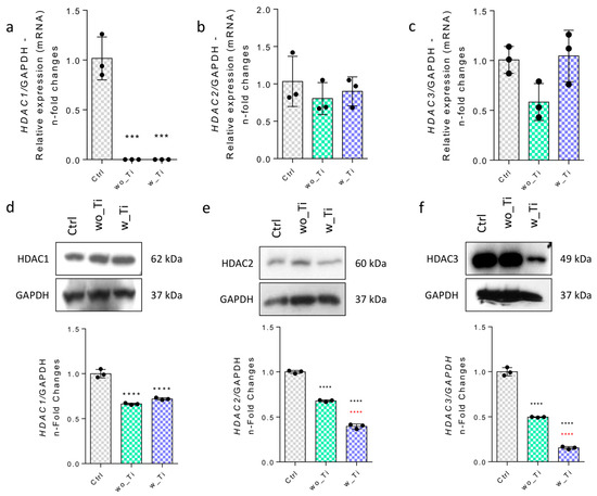 Effect of titanium-enriched medium on HDAC1, HDAC2, and HDAC3. The effect of Ti-enriched medium on the expression of genes related to histone acetylation. HDAC1 (a), HDAC2 (b), HDAC3 (c) were evaluated by qPCR. The control group (Ctrl) values were normalized to 1 and the relative values obtained for wo_Ti or w_Ti are shown as fold changes. The effect was later evaluated regarding the protein level, and the profile was very similar to the transcripts, as follows: HDAC1 (d), HDAC2 (e), and HDAC3 (f). Representative blots as well as the analysis of the densitometry of the bands are shown. Note: HDACs: histone deacetylases; Ctrl: control group; wo_Ti: medium enriched with titanium without DAE; w_Ti: medium enriched with titanium with DAE. *** p < 0.0002, **** p < 0.0001 when compared with the control (Ctrl) group; and **** p < 0.0001 when comparing wo_Ti with w_Ti. The experiment was performed in triplicate (n = 3).