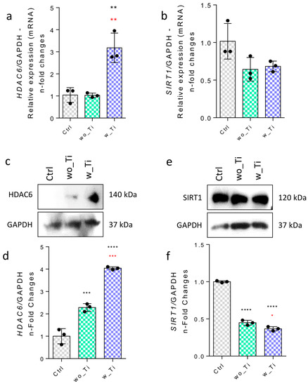Effect of titanium-enriched medium on HDAC6 and SIRT1. The effect of Ti-enriched medium on the expression of HDAC6 (a) and SIRT1 (b) was evaluated by qPCR, and the protein expression by Western blot was measured (c,d,e,f, respectively). Differences were considered statistically significant when ** p < 0.001, *** p < 0.0002, **** p < 0.0001 when compared with the control (Ctrl) group; and * p < 0.04, ** p < 0.001, *** p < 0.0002 when comparing wo_Ti with w_Ti. Note: HDACs: histone deacetylases, SIRT1: Sirtuin 1, Ctrl: control group. GADPH (gene and protein) was considered a housekeeping gene in this study. The experiment was performed in triplicate (n = 3).