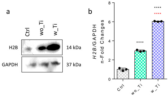 Effect of titanium-enriched medium on H2B. The effect of Ti-enriched medium on the expression of H2B was evaluated by performing Western blot (a), densitometry and statistics are also shown (b). GAPDH was a loading control. **** p < 0.0001 when compared with the control (Ctrl) group; and **** p < 0.0001 when comparing wo_Ti with w_Ti. The experiment was performed in triplicate (n = 3).