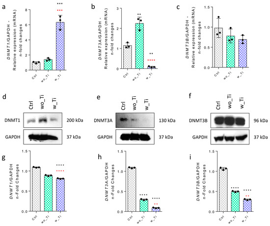 Effect of titanium-enriched medium on DNMTs. Firstly, the gene activities were evaluated by qPCR, as follows: DNMT1 (a), DNMT3A (b), and DNMT3B (c), where GADPH gene was used to normalize the data as a housekeeping gene. Thereafter, the protein profile was evaluated by Western blot by resolving 75 μg of sample per lane and later incubating it with specific antibodies. Representative immunoblots of DNMT1 (d,g), DNMT3A (e,h), DNMT3B (f,i) are displayed. Densitometric analysis of immunoblots was normalized to the protein ratio of controls and GAPDH, here used as loading control (housekeeping control). Differences were considered statistically significant when ** p < 0.001, *** p < 0.0002, **** p < 0.0001 when compared with the control (Ctrl) group; and ** p < 0.001, *** p < 0.0002, **** p < 0.0001 when comparing wo_Ti with w_Ti. The graphs show mean ± standard deviation of three independent experiments. DNMT: DNA methyltransferase, GAPDH: glyceraldehyde-3-phosphate dehydrogenase, Ctrl: control group, wo_Ti: medium enriched with titanium without DAE, w_Ti: medium enriched with titanium with DAE. The experiment was performed in triplicate (n = 3).