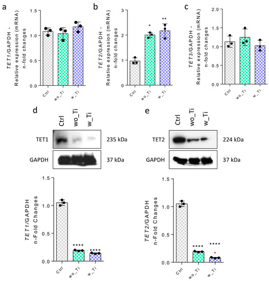 We also investigated both TET1 and TET2 genes and related proteins by using qPCR and Western blot technologies, respectively. TET1 and TET3 genes remain unchanged (Figure 6a,c) while the TET2 gene was more highly expressed (~2.5-fold change) than in the control cultures of endothelial cells responding to both wo_Ti and w_Ti (Figure 6b), although protein content shows a significant decrease in both TET1 and 2 (Figure 6d,e).