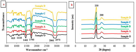 The HDPE samples reinforced by hybrid nanofillers with a ratio of 1:1 of TiO2 NPs and Gr were characterized by IR-spectroscopy and X-ray diffraction. The IR spectra analysis of HDPE nanocomposite samples is illustrated in Figure 1a. The collected data from acquired spectra contributes to evaluating the interaction between HDPE resin and the hybrid nanofiller. In the case of pure HDPE, Sample O, the transmittance exhibited bands at wave numbers of 815, 1118, 1461, 1793, 2861, and 2973 cm−1 [42,43,44]. The status and peak intensities of the bands may be assigned to various groups of bending vibrations. The functional bonds can be identified as single, double, or non-conjugated. The analysis indicates that the double cis bond (-CH=CH-) is seen at 815 cm−1, while the double trans bond (-CH=CH2) appears at 1118 cm−1. Moreover, the CH3 vibrational bond is observed at wave number 1461 cm−1 and the CH2 functional bond is located at 2861 cm−1. IR peak at wave number 1793 cm−1 indicates a functional non-conjugated group. While a functional single bond group (C-CH3) appears at 2973 cm−1. IR spectra were recorded for HDPE nanocomposite samples, and the results indicate that the samples provide the same functional band groups as the sample O. These results make it evident that the hybrid nanofillers were successfully incorporated into an HDPE matrix.