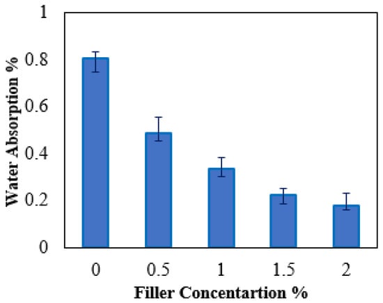 Water absorption is a basic indicator for evaluating the performance of nano-polymers because it affects their life cycle. Figure 2 demonstrates the water absorption percentage of pure HDPE and its nanocomposite samples. It was indicated that HDPE nanocomposite samples exhibited lower water absorption by about 39–77% compared to that of pure HDPE. It may be realized that the loading of hybrid nanofiller had a significant effect on the composite’s structural features. A good physical mixture between hybrid nanofillers and HDPE matrix contributes to improving wettability and reducing voids. This could be evident from the fact that increasing the loading of hybrid nanofillers leads to reduced water accumulation through the internal structure of the nanocomposite matrix [41].