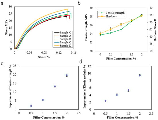 The mechanical properties of HDPE nanocomposite samples were evaluated by examining the tensile strength, elastic modulus, and hardness. The stress-strain curve for HDPE nanocomposite samples was illustrated in Figure 3a. It can be observed that the addition of hybrid nanofillers leads to an increase in ultimate tensile stress. The maximum tensile stress is achieved with a higher loading amount of hybrid nanofiller, Sample D, resulting in a tensile stress of 28.4 MPa, as displayed in Figure 3b. Moreover, the strain of the nanocomposite samples was enhanced by increasing the filler loading content. It is evident from the fact that the fillers limit the interspaces between molecules of the HDPE matrix, which leads to restricted mobility and plastic deformation [48]. Sample B shows the highest strain compared with other loading amounts. The hardness values of HDPE nanocomposite samples are presented in Figure 3b. It can be found that the hardness increases linearly with increasing the loading content of hybrid nanofillers. The hardness Shore D value increases up to 20% with the highest loading content of filler compared to pure HDPE. The improvement percentages of tensile strength and elastic modulus were estimated, as illustrated in Figure 3c,d, respectively. High-loading content exhibits the highest improvement percentages of tensile strength and elastic modulus, with approximately 19.8% and 9.4% improvement, respectively. This shows that nanofillers contribute to enhancing the ductility and strain rate of HDPE matrices [36,40]. Table 2 outlines the mechanical features of HDPE nanocomposite samples compared with the pure sample.