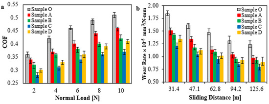 The friction coefficient and wear rate were measured in accordance with ASTM G99-95 for HDPE nanocomposite samples. Figure 4a shows the variation of the friction coefficient against the normal applied loads for different loading contents of hybrid nanofillers, TiO2 NPs, and Gr. For all HDPE samples, the data indicate a significant rise in the friction coefficient because of the increased effective loads. As for samples embedded with hybrid nanofillers, it can be assumed that the nanofillers contribute to reducing friction in the contact area. This may be attributed to the rolling effect of TiO2 NPs and the self-lubricating feature of graphene, which exhibit a distinct impact on the sliding conditions. Hence, it can be concluded that increasing loading content of hybrid nanofillers leads to a gradual decrease in the friction coefficient [49,50]. This note is considered consistent even with a loading content of 1.5 wt.% of hybrid nanofillers and an equal ratio of TiO2 NPs and Gr. The minimum friction coefficient is achieved with Sample C and a 1.5 wt.% loading amount of hybrid nanofillers, so the friction coefficient reduces with approximately a 27.5% improvement. An increase in friction coefficient may be attributed to high loading amount of hybrid nanofillers in the polymer matrix, as occurred with Sample D, which increases the possibility of particle agglomeration. It is evident that the agglomeration response is to restrict the particles’ dispersion and the shear flows between layers. Furthermore, the wear rate was estimated via the experimentally recorded amount of sample weight that indicated the weight loss of each sample, as shown in Figure 4b. The results indicate that the same trend in friction behavior is repeated even with the wear rate. It seems clear from this figure that the reinforcement of the HDPE matrix with hybrid nanofillers exhibits a good reaction to wear. Under the sliding action, the wear rate for Sample C, with a loading content of 1.5 wt.%, reduces with an overall decrease of 36.3% less than the pure HDPE. This improvement can be attributed to the presence of graphene, which contributes to the formation of a lubricant layer on the contact area [39,50]. In addition, the rolling effect of particles reduces friction, which enhances wear performance. While many problems appear at the interface with the overloading of nanofillers like particle agglomeration and poorly bonded slipping layers. This may be attributed to the high loading content of over 1.5 wt.% of nanofillers, which is thought to constrain the internal molecule’s mobility, thereby causing plastic deformation. This shows that loading content of 1.5 wt.% of hybrid nanofiller contributes to enhancing the frictional and wear rates of HDPE matrix.