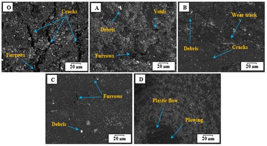 The SEM images were employed to inspect and examine the mechanisms of the matrix and the nanocomposite structure, as depicted in Figure 6. It can be observed that the surface of Sample O seems to weaken the cohesion layers, where cracks and furrows appear. Moreover, the samples reinforced with hybrid nanofiller exhibit good cohesion between interlayers and less breakup. The image recorded for sample A indicates the presence of furrows and voids on the surface, unless the sample structure looks better compared to the pure sample. It can be observed that the matrix structure improves with the increase in content loading, as voids and cracks are limited, as illustrated in SEM images of samples B and C. This reveals that the hybrid nanofillers, TiO2 NPs and Gr, contribute to enhancing the matrix structure and bonding the layers [50]. Therefore, the incorporation of nanofillers with the matrix prevents crack propagation on the sample surface. Nevertheless, increasing the nanofiller amount causes agglomeration and weakens the dispersion of particles, which leads to plastic flow at the sliding area.