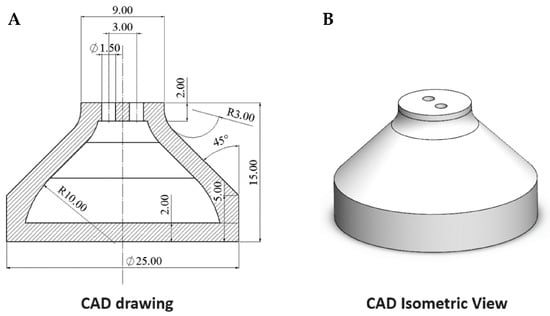 Figure 2A reports the design of the reservoir in the form of a 2D CAD drawing and Figure 2B reports a trimetric 3D view. In particular, the reservoir was designed with a cone-shaped structure (slope of about 45°) to minimize the material content and, in parallel, to ensure a good printed outcome. The structure that will be filled with diluted insulin possesses two holes on the top surface to enable an efficient flushing of the tank with nitrogen, needed to prevent air from being in contact with insulin.