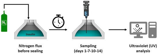 Schematic showing insulin storage set-up and aggregation tests. After filling the tank with insulin, a gaseous nitrogen was fluxed to remove the air present inside, before a firm sealing. On day 1, 7, 10 and 14, a sample of insulin was taken from the tank for UV assays. Between sampling days, the tank was kept firmly sealed with an inert atmosphere made of nitrogen.