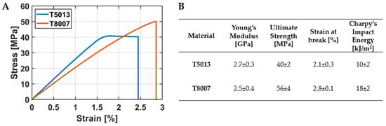Mechanical characterization for the two COCs: (A) Graph showing the stress–strain curves for T5013 and T8007, and (B) table summarizing the obtained values for the properties measured with tensile and impact tests. Data are reported as mean ± standard deviation.