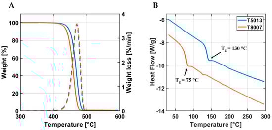 Thermal assessment of the two COC grades using TGA and DSC: (A) thermograms highlighting weight and weight loss, as a function of the temperature, and (B) heat flow as a function of the temperature with arrows indicating the glass transition temperature (Tg).