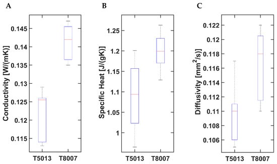 Figure 6 shows the outcomes of the other thermal properties. For all the considered parameters, namely, the conductivity, specific heat, and diffusivity, T8007 presented higher values, with statistical significance, than those of the T5013 (p-value ≤ 0.001).