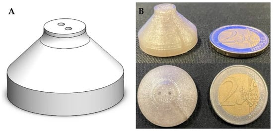 Fabrication of the reservoir to test the insulin anti-aggregation properties of the geometry/material: (A) CAD model, and (B) 3D-printed device (left); a 2 EUR coin for size comparison (right).