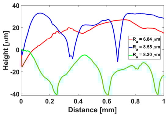 Performing the geometrical assessment with the caliper on the main dimensions (i.e., height, base circumference, hole diameters on the top surface), an average dimensional error of 2% with a maximum deviation of about 3% for the top-hole diameters could be estimated. The assessment of the surface texture was analyzed using a digital optical profilometer. The analysis of three characteristic profiles displayed a roughness Ra in the range of 6.84–8.55 µm and localized variations between peaks and notches in a range of 0–40 µm, as reported in Figure 8.