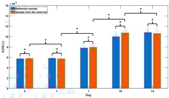 Bar graph reporting the outcomes of UV analysis performed at an absorbance of 350 nm (A350) to assess the aggregation of insulin at 0, 1, 7, 10, and 14 days comparing insulin samples stored in the fabricated T8007 reservoir (orange bars) and pristine insulin, used as reference (blue bars). Results from the statistical analysis are reported with the following symbols: ° p-value ≥ 0.317; * p-value ≤ 0.005.