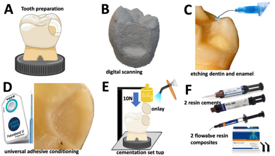 Schematics of the preparation of specimens for optical microscopy. (A) Tooth preparation, and (B) digital scanning image. (C) Total etching procedure, and (D) adhesive conditioning on dentin and enamel. (E) Cementation on 10 N loading (1 kg weight) through a dental inspector apparatus. (F) Resin-matrix cements and flowable resin-matrix composites.