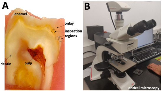 (A) Optical micrography at ×10 of the cross-sectioned onlay to dentin and enamel interface. (B) Optical microscopy.