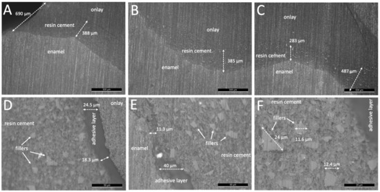 Optical microscopy images of the onlay interfaces using a resin-matrix cements are shown in Figure 3 and Figure 4. The resin-matrix cement specimens from group M showed a thick layer at the coronal and cervical margin regions, as seen in Figure 3. On the coronal region, the layer thickness values of the resin-matrix cement achieved up to 690 µm, while the mean thickness at the cervical margin was around 480 µm. The layer thickness of the resin-matrix cement ranged from 280 µm up to 690 µm. Additionally, the adhesive layer did not flow on cementation, resulting in an adhesive cement layer thickness ranging from 18 µm up to 40 µm, as seen in Figure 3D–F. On higher magnification images, inorganic fillers were noticed with a mean size ranging from approximately 11 µm up to 24 µm (Figure 3D). As seen in Figure 4, the resin-matrix cement specimens from group B also showed a thick layer at the coronal and cervical margin regions. On the coronal region, the layer thickness values of the resin-matrix cement achieved up to 1.28 mm, while the thickness at the cervical margin showed the lowest mean values of around 140 µm.